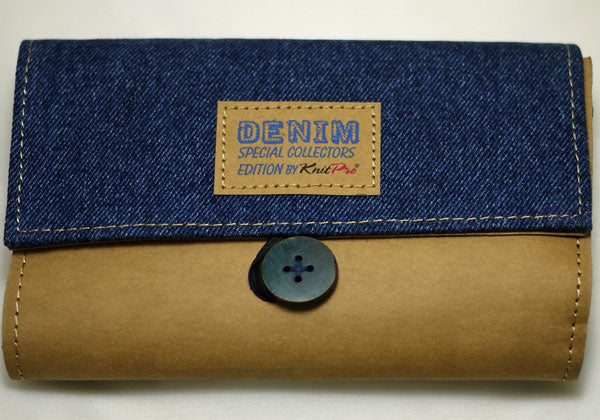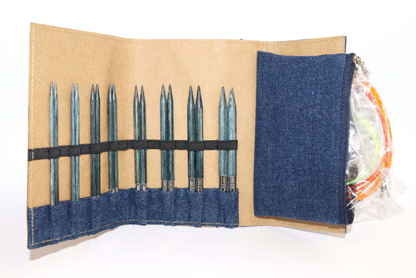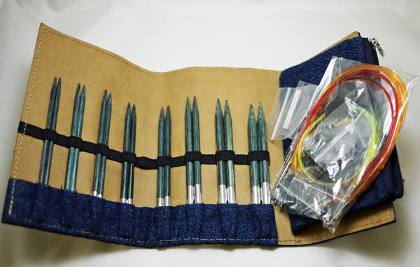 8ペアのインディゴカラー付け替え式輪針針先とカラーケーブルケーブル、エンドキャップ、が特製布製ケースに入っています