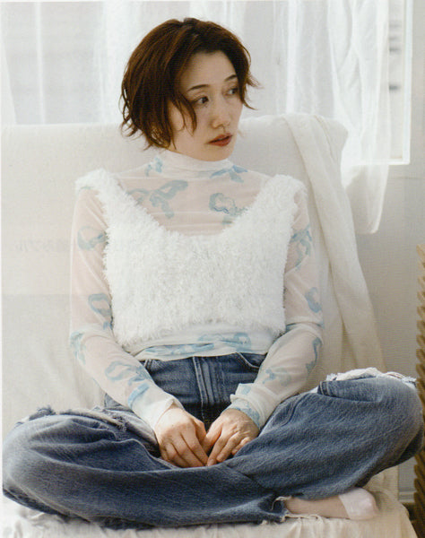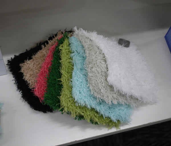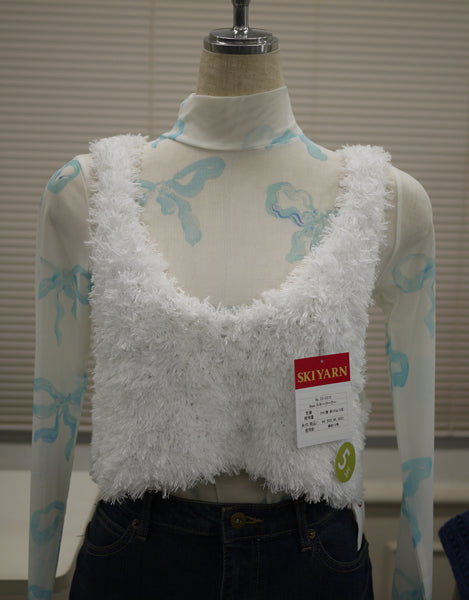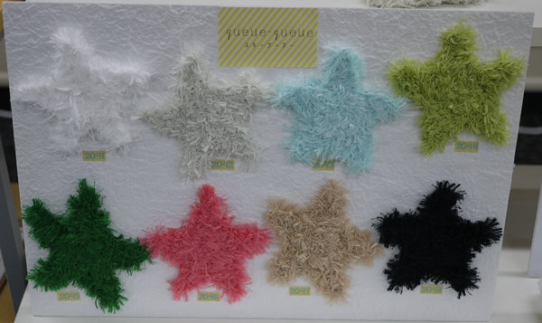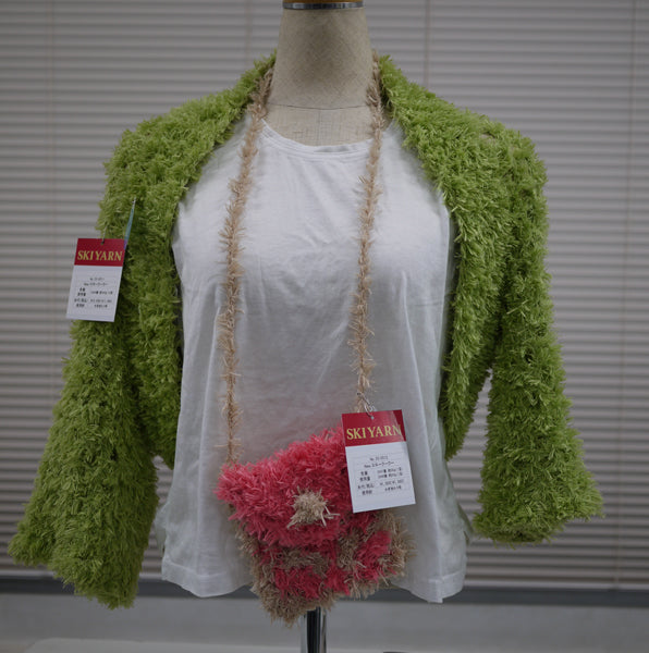 綿素材のファーヤーンです。太さの異なるファーが合わさってちょうどいいボリューム感になっています。単独でもほかの毛糸と組み合わせても楽しいシーズンレスの糸で、個性的な作品に仕上がります。