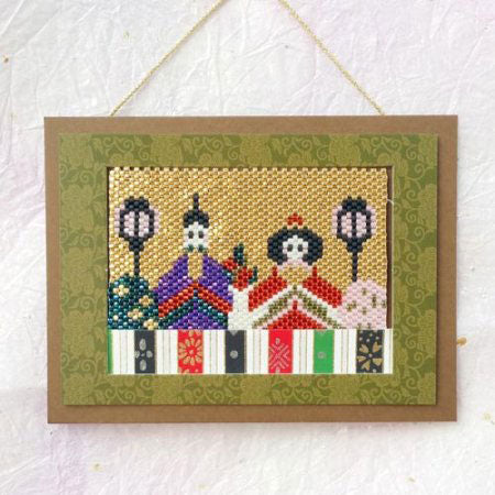 1,000個以上のビーズを使ってビーズステッチ作り上げるこの「桃の節句飾り」の出来上がった時の達成感を楽しんでいただき、完成した作品を額縁に入れて飾っていただくようなイメージで「飾り台紙セット付き」に仕立てました。
