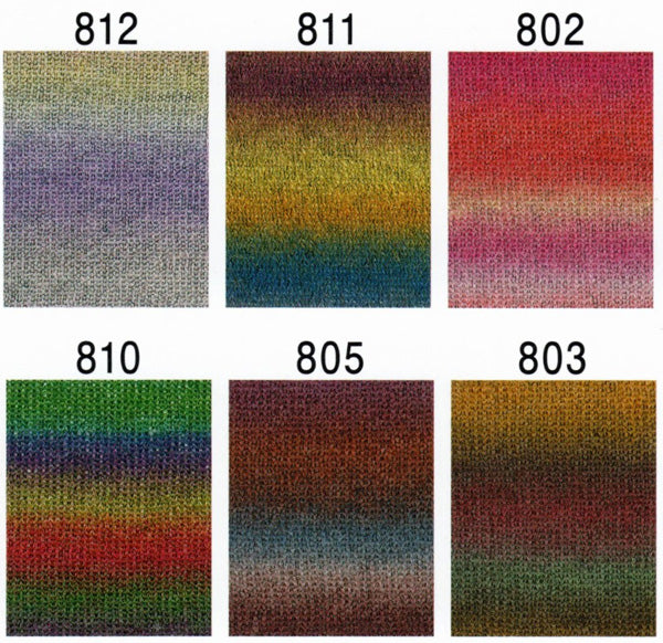 「キッドモヘヤファイン」をロングピッチの段染めにしました。糸を紡績する前の原料を5色の段染めにするため、糸にしてからのプリントでは出せないぼかし効果も美しく、単用、引き揃え共に使いやすい極細糸。: