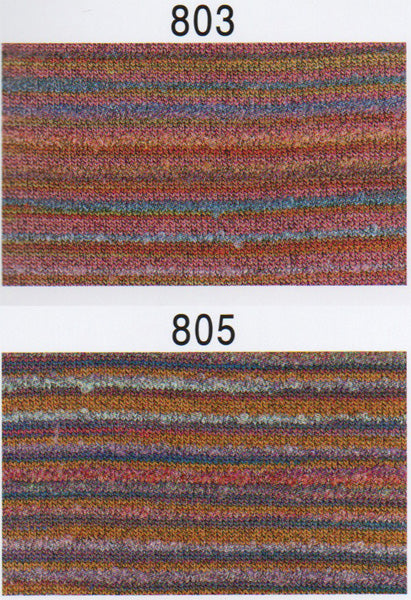 多色にミックスしたロングピッチの段染ループ、トップメランジ、段染ストレート糸の3種類の形状が交互に現れる楽しい糸です