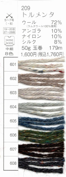 [素材] ウール72%、アンゴラ10%、ナイロン10%、シルク8% [長さ・単位] 50g玉巻/約179m [使用針] 棒針5~7号・かぎ針5/0~7/0号 [標準ゲージ] 19~20目/27~28段 [必要玉数] 婦人プルオーバー250g・紳士プルオーバー300g |
